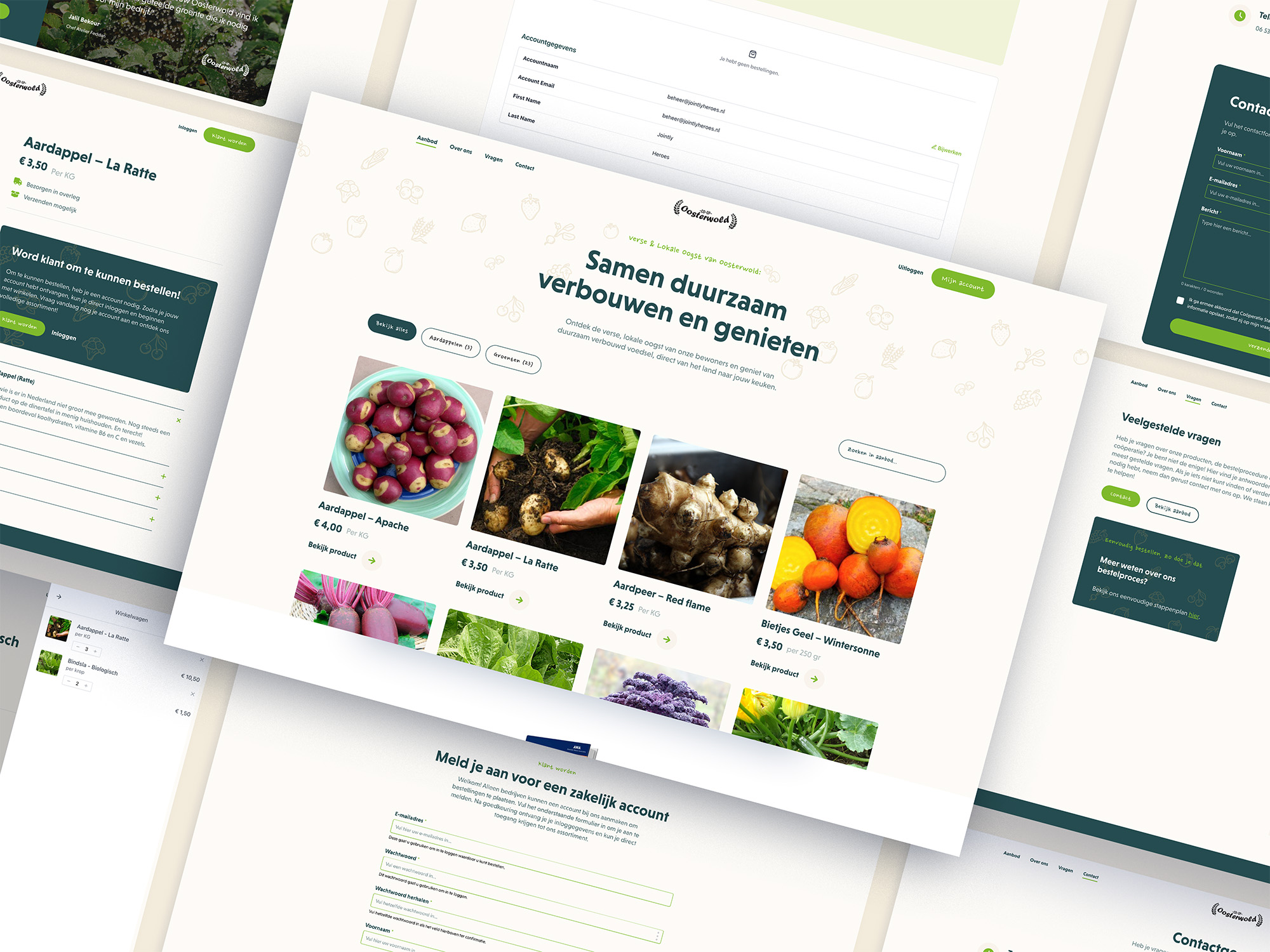 Oosterwold is een van de grootste stadslandbouwprojecten ter wereld, gericht op duurzaamheid en voedselzekerheid. Bewoners produceren voedsel op hun eigen land, maar velen hebben moeite om dit succesvol te doen of hun oogst goed te benutten. De Coöperatie Stadslandbouw Oosterwold helpt bewoners elkaar te ondersteunen en lokale producten zinvol te verwaarden. Voor dit project hebben wij een webshop ontwikkeld waar bedrijven lokale oogsten kunnen kopen en bijdragen aan de voedselketen.