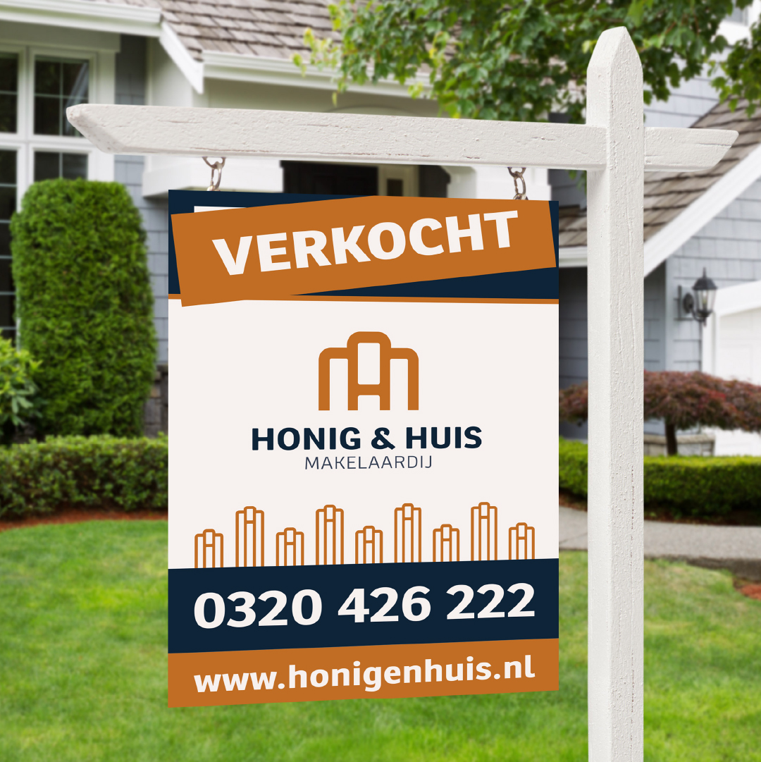 Honig & Huis, een nieuwe makelaar, had geen naam, geen branding, en geen concept. Nicoline Honig wilde graag haar naam in de bedrijfsnaam verwerkt zien. Onze taak was om vanaf nul te beginnen en een naam, huisstijl en alle benodigde drukwerk te creëren.